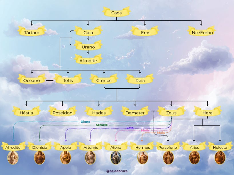 A história se inicia com Cronos, filho de Gaia (a Terra) e Urano (o céu). Cronos desposou sua irmã Reia e, juntos, produziram os deuses e deusas do Monte Olimpo, incluindo, além de Zeus, Hera (que também se tornou esposa de Zeus), Hades e Poseidon, entre outros.